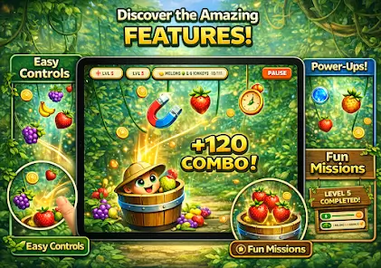 《水果丛林》的设计灵感来自生机勃勃的热带雨林。游戏背景中可以看到高大的棕榈树、浓密的藤蔓以及阳光穿过树叶洒下的光影效果,使整个画面充满自然气息。